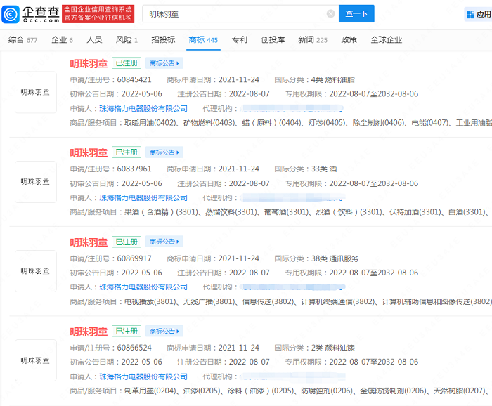 企查查APP显示,珠海格力电器股份有限公司已申请全部45个国际分类的“明珠羽童”商标,当前商标状态均为已注册。此外,格力电器近期还注册多枚“明珠”商标,当前状态为注册申请中。