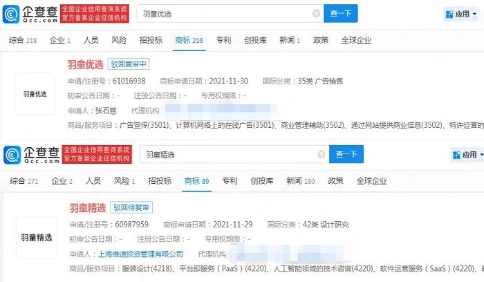 此外,自然人张某和上海某投资管理有限公司于2021年11月分别申请“羽童优选”“羽童精选”商标,但两商标当前流程均为驳回复审。