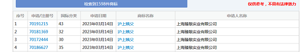 近日,沪上阿姨关联公司上海臻敬实业有限公司申请注册多个“沪上姨夫”商标,国际分类为广告销售、啤酒饮料、方便食品等,当前商标状态均为申请中。
