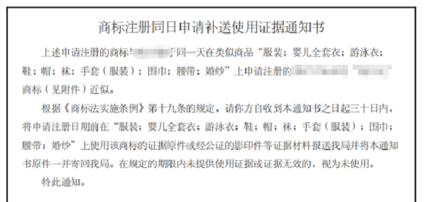 当出现商标同日申请的情况,商标局会下发《商标注册同日申请补送使用证据通知书》给申请人,商标局要求商标申请人在规定的时间内提交有效的在先使用商标证据,也就是实用在先原则,以决定谁能获得商标申请资格。