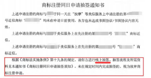 在规定的时间内,协商未果的,商标局会以抽签的方式确定申请人。申请人收到同日申请抽签通知书后,需严格按照规定准备好要提供的材料,并准时参加现场抽签,若未准时参加或资料不全者,则视为放弃,商标归另一方所有。