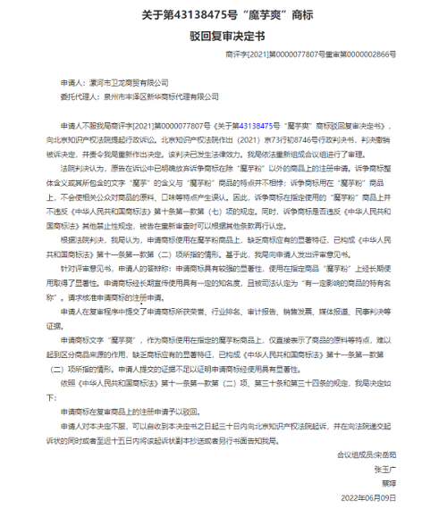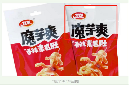 后于2019年以漯河市卫龙商贸有限公司名义申请注册同类同名魔芋爽商标均被驳回,且理由均为:诉争商标指定使用在咖啡,茶饮料,糖,糖果,蜂蜜,面包,糕点,蛋糕,谷粉制食品,以谷物为主的零食小吃,谷类制品,面粉制品,方便面,食用面筋,魔芋粉,冻酸奶(冰冻甜点),酱油,酵母,食用芳香剂,家用嫩肉剂等商品上,直接表示了指定商品的原料等特点,易使相关公众对商品的质量或特点与“魔芋”产生联系从而导致误认。