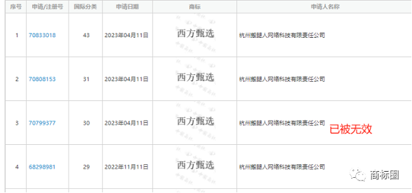 目前“西方甄选”已作为商标分别在29类,31类,43类被作为商标注册,目前皆已申请成功,申请人是杭州搬腿人网络科技有限责任公司。申请时间分别是去年年底以及今年年初。