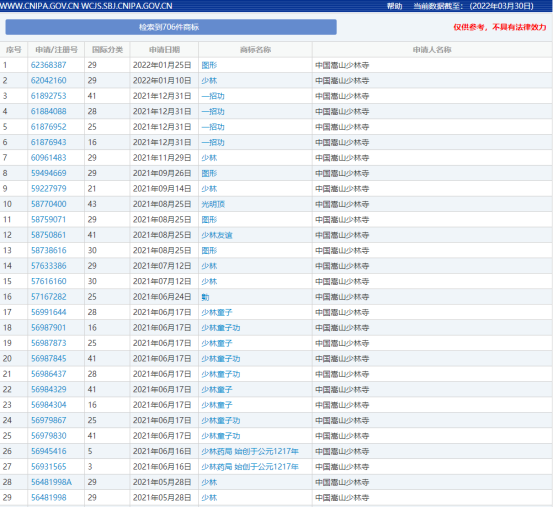 国家知识产权局商标局中国商标网数据显示,1997年7月10日至2022年3月30日,嵩山少林寺共申请商标706个。